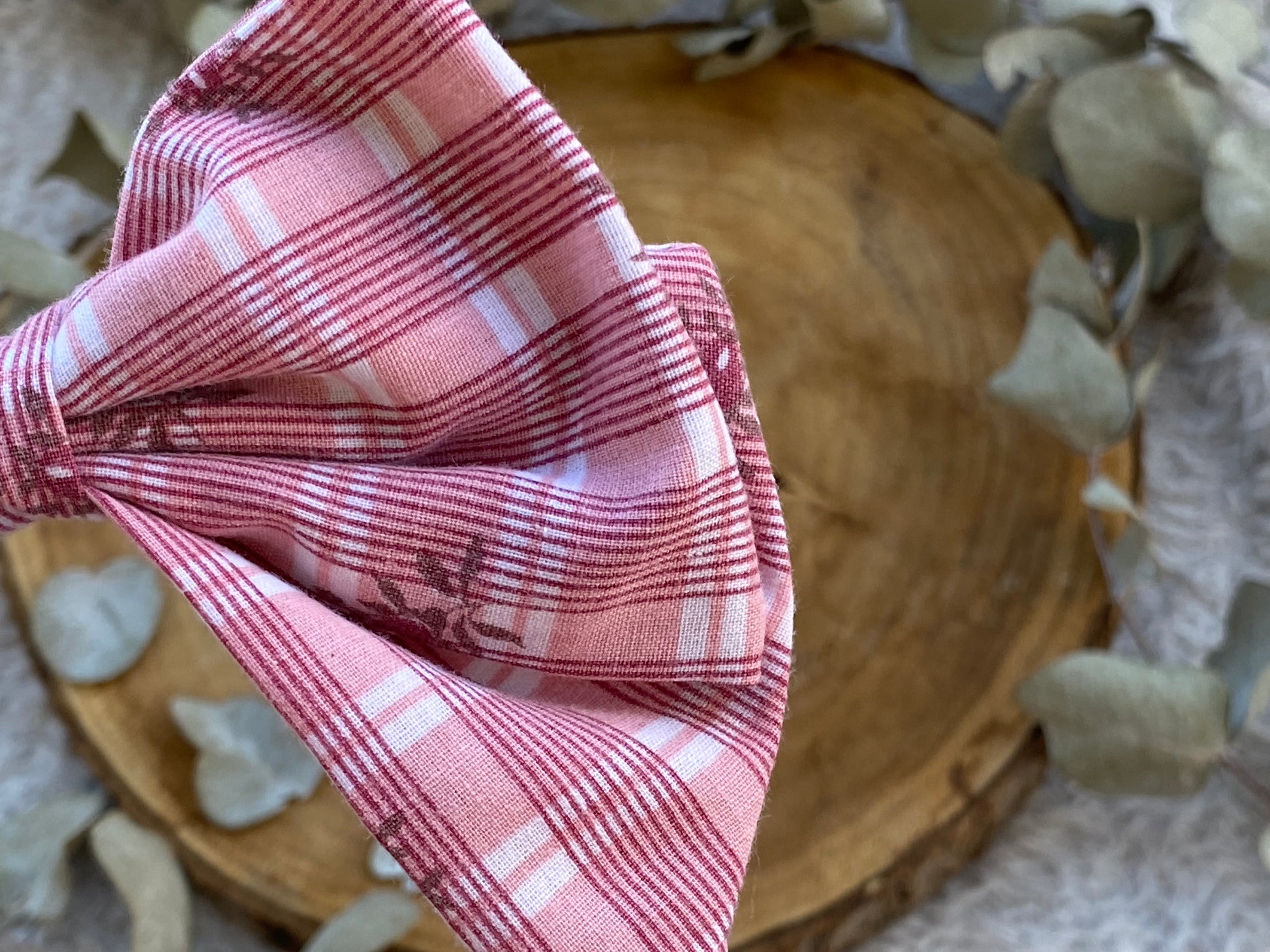 Barrette pour les cheveux en forme de nĆud tartan Ă rayure et fleur rose et blanc cousu mains avec amour. Pour accessoiriser vos tenues en la plaçant dans vos cheveux, aprĂšs votre sac ou encore sur vos vĂȘtements.