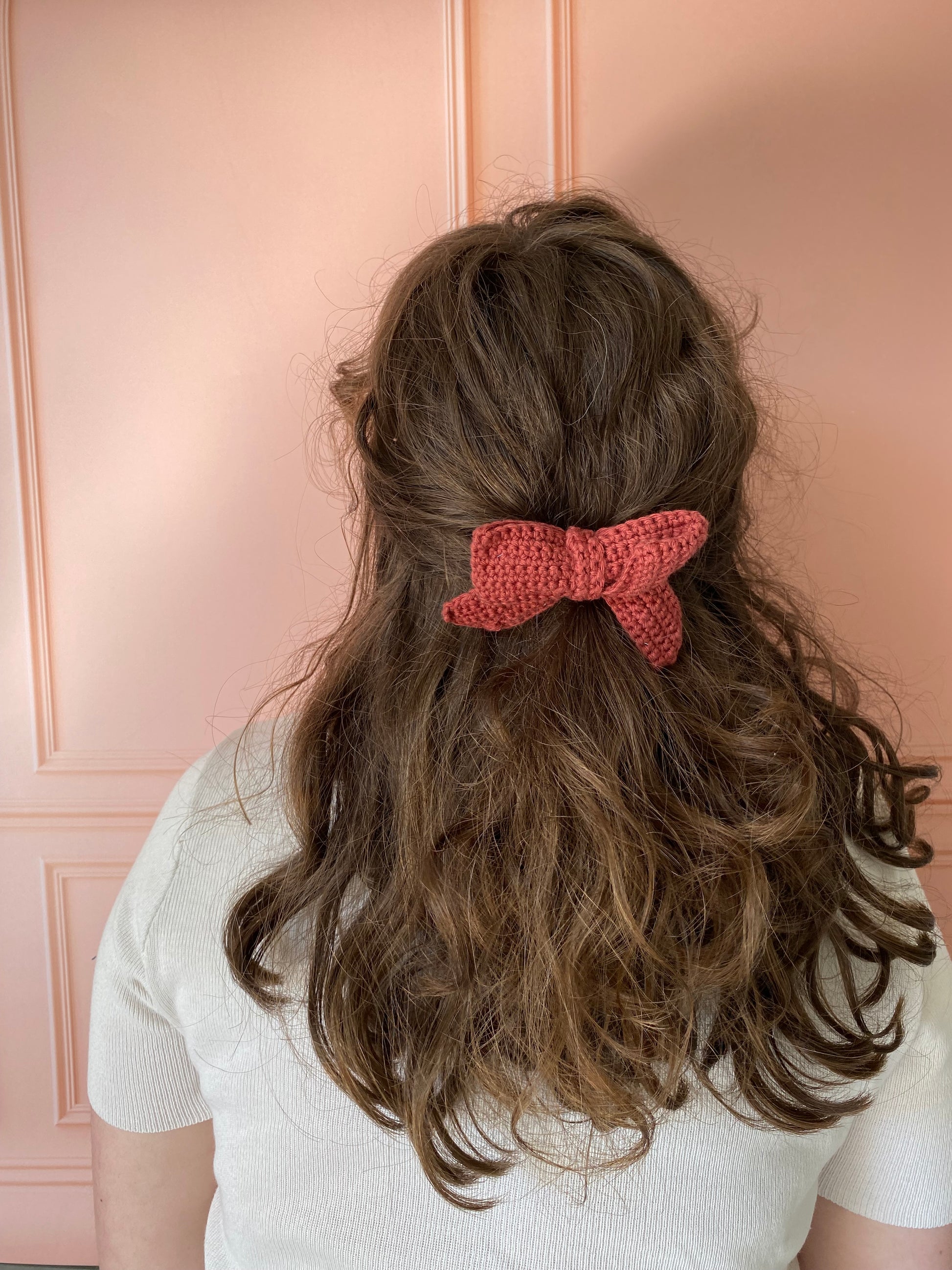 Barrette pour les cheveux en forme de nœud réalisé en crochet. Deux coloris disponible beige rosé ou rose rouge. Pour accessoiriser vos tenues en la plaçant dans vos cheveux, après votre sac ou encore sur vos vêtements.