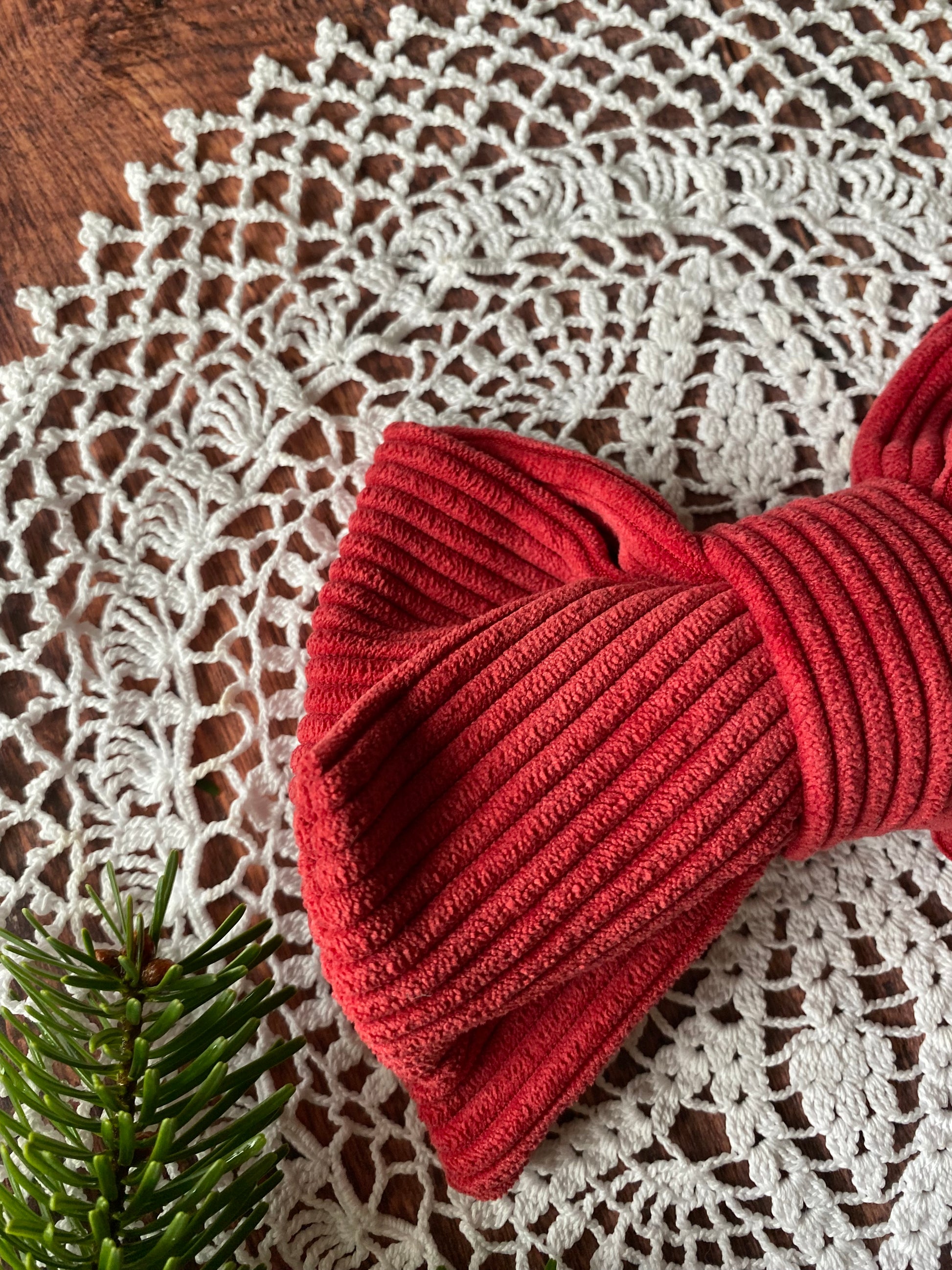Barrette pour les cheveux en forme de nœud en velour cotelé rouge cousu mains avec amour. Pour accessoiriser vos tenues en la plaçant dans vos cheveux, après votre sac ou encore sur vos vêtements.