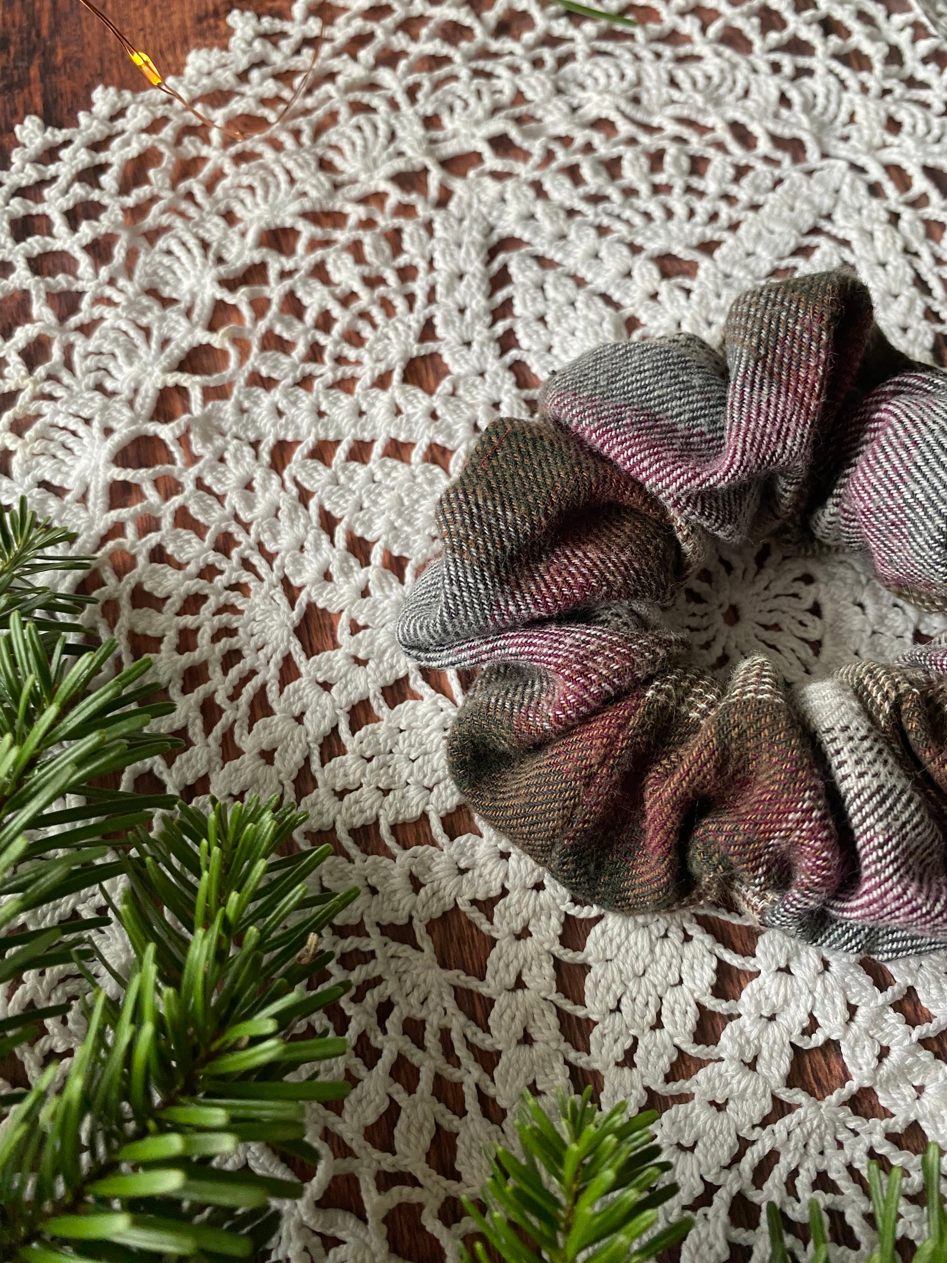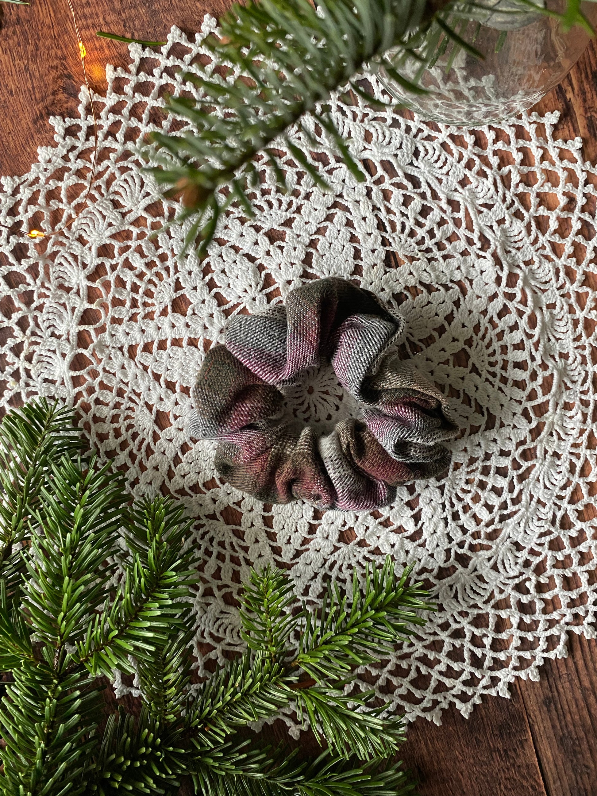 Chouchou scunchie cousu main en flanelle motif tartan gris, pune, blanc et beige. Idéal pour parfaire votre tenu avec un petit accessoire unique made in France.